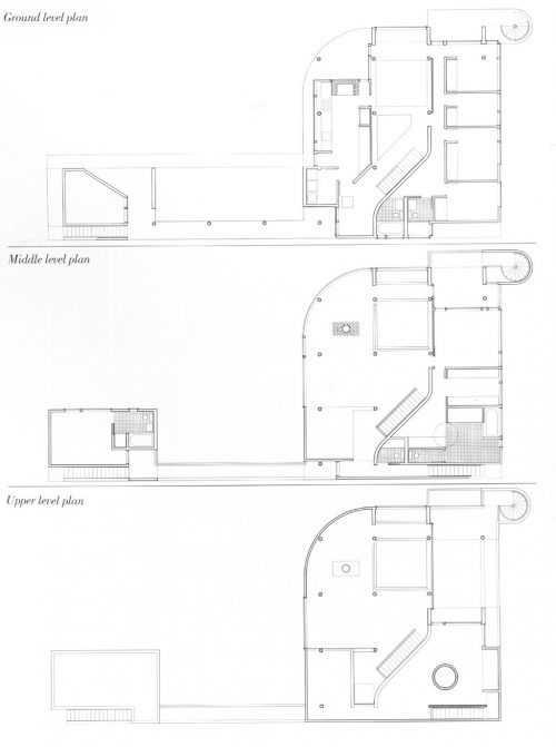 Ventanas «en longueur» ventanas cuadradas de diversos tamaños y grandes ventanales se suceden a lo largo de las superficies de estos volúmenes. Pero ya no hay aquí trazados reguladores, intenciones programáticas ni contenidos conceptuales. Hay simplemente el uso libre y gozoso de los elementos sacralizados del lenguaje racionalista: la arquitectura que nos habla de la arquitectura, el metalenguaje de la operación manierista. Pero la fruición en el uso del lenguaje no debe confundirse con arbitrariedad. Aquí como en la Casa Smith, como en la Casa Douglas y como en las mejores obras de este período, la forma y la disposición de las perforaciones en la caja muraria guardan una estricta correspondencia con lo que ocurre en el interior de la casa.