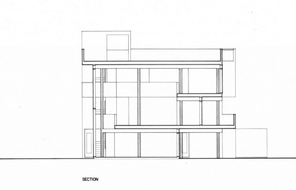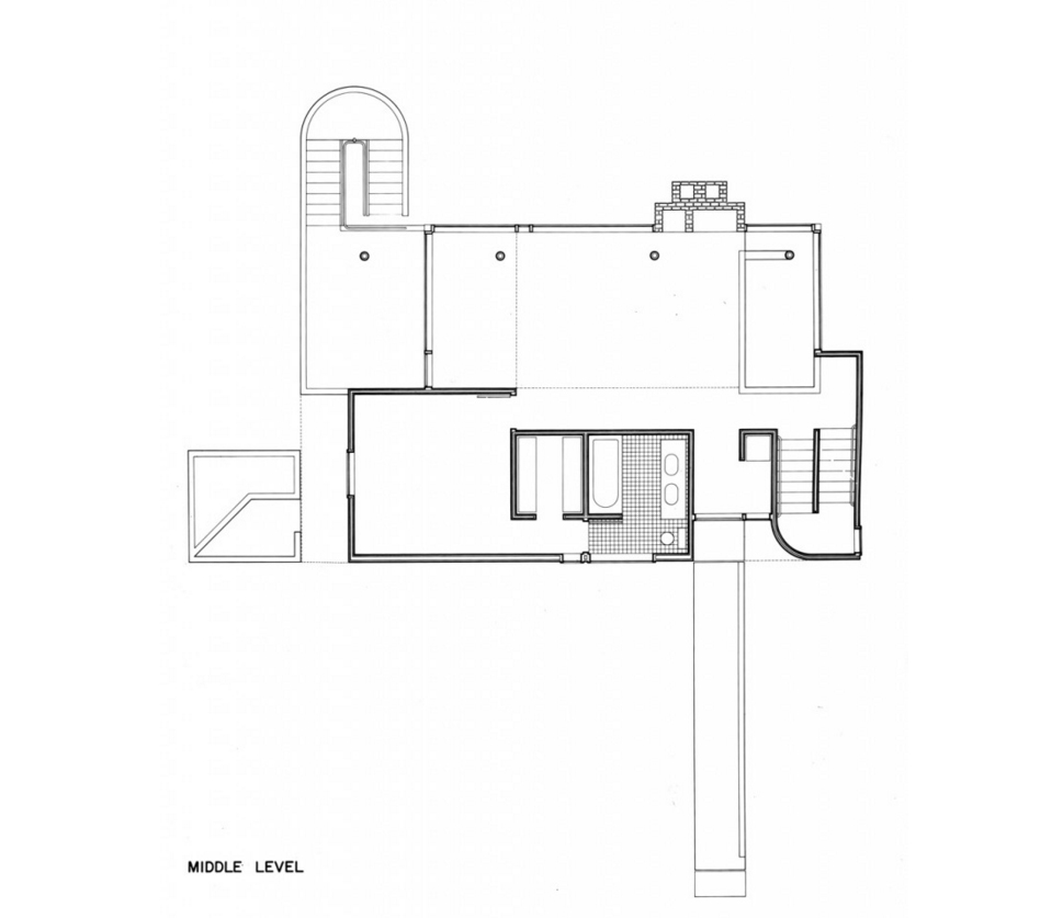 «…Hay una estratificación formal, dando una sensación de progresión, cuando se atraviesa el sitio desde el camino de entrada, la orilla, y la «línea de progresión” determina los principales ejes. Perpendiculares a este eje, los planos que se intersectan en la casa responden a los ritmos de la ladera, árboles, afloramientos de roca, y la costa… » (Richard Meier, Oxford University Press, 1976. p23)