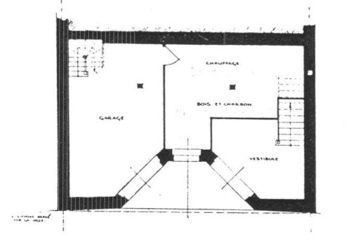 En el más bajo de estos entrantes, a nivel de calle, se aprecian dos puertas, protegidas por el balcón superior, la de la izquierda conduce al garaje y la de la derecha es la entrada principal a la vivienda tras la cual hay un pequeño hall donde nace una escalera que discurre como en una fosa para conducir final¬mente al atelier del propietario.