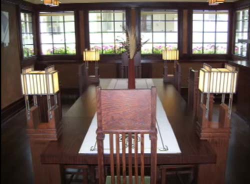 En la Casa Westcott, colocó dos particiones de madera en ángulo recto con la chimenea y en ellos construyó dos asientos y una biblioteca, rincón familiar iluminado mediante una luz indirecta. En este salón se podía acceder a un patio elevado, en el exterior, a través de dos puertas simétricas. Sobre estas puertas se colocó una rejilla de metal, especialmente diseñada como apoyo para un toldo de verano.