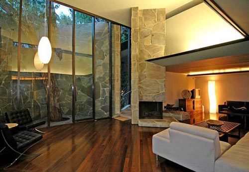Los muros externos son de piedra natural de diversos colores mientras que los que envuelven la casa son de vidrio desde el suelo hasta el techo.