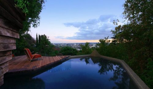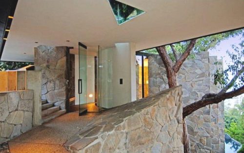 Esta casa estilo europeo tiene un lujoso diseño interior y cuenta con una espectacular vista a la ciudad de las luces americana. Sus techos son altos y sus enormes muros de piedra combinan con paredes de cristal. Estos muros exteriores de piedra oscura, además de conectar la casa con la colina, protegen lateralmente el interior.