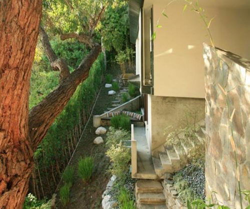 La entrada principal sirve como punto de transición entre la baja cubierta orientada a la calle y los muros de piedra que con una altura de 5 metros contribuyen a estructurar de forma casi dinámica los niveles del terreno, descendiendo por la colina en forma de cascada