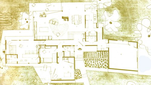 Los arquitectos reflejan la línea descendente del sitio con la línea pendiente del techo, proporcionando a la casa una fuerte relación con su entorno. Las enormes paredes de vidrio y un sistema de calefacción por el suelo fueron las características más notables de esta casa. También se prestó especial interés por las grandes aberturas al exterior, lo que permitió un fluido diseño entre los espacios interiores-exteriores.