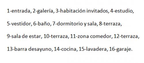 A la derecha un estrecho pasillo lleva al garaje y zona de servicio de la casa. A la izquierda, se convierte en una galería que conduce al ala de los dormitorios, el principal al final del pasillo y en la mitad una habitación para huéspedes con su correspondiente baño, ambos al mismo nivel. El estudio que comunica con este ambiente está un poco más alto.