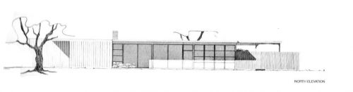 Las paredes se curvan ligeramente hacia la parte posterior de la vivienda donde dos anchos paneles de vidrio translúcido permiten el paso de luz desde el patio de servicio. La larga horizontalidad de la construcción se rompe con la repetición de un patrón con cambios verticales sobre la superficie convexa y cóncava.