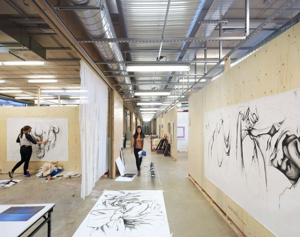 Se conservó y restauró el Granary Building utilizando materiales industriales y robustos. A este edificio se le asignó la función de entrada y fachada principal, para tras el desarrollar una gran calle de 110 metros de largo, 12 de ancho y 20 metros de altura que se convierte en un inmenso atrio central que conecta todos los espacios docentes y los baña de luz natural que se recoge por vía cenital a través de una cubierta sintética semitransparente de ETFE. Este espacio es el “alma” de todo el proyecto, un lugar lleno de vida donde los estudiantes puedan encontrarse, charlar y desarrollar actividades, la pieza que articula el resto del proyecto, tanto a nivel arquitectónico como social y funcional. A lado y lado de esta “calle” principal se sitúan dos edificios encargados de recoger la mayoría del programa docente.