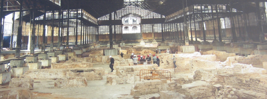 Una plataforma recorre todo el contorno del yacimiento, permitiendo al visitante observar las ruinas que están debajo. Dos amplios pasillos soportados por grandes vigas unen los dos lados más anchos de misma, dejando tres grandes espacios abiertos. La sujeción de la plataforma se ha resuelto con unos grandes pilones de hormigón que, además de sustentarla, refuerzan los cimientos de las columnas de hierro originales de la estructura del mercado.