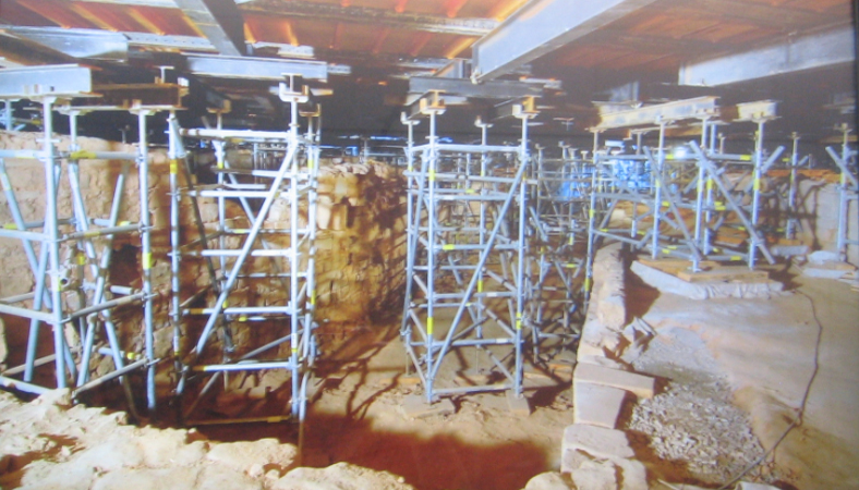 En todas las intervenciones se respetaron la morfología, el sistema constructivo y los materiales de este singular lugar, estructurado en dos niveles, el yacimiento bajo rasante y la plataforma transitable a pie de calle.