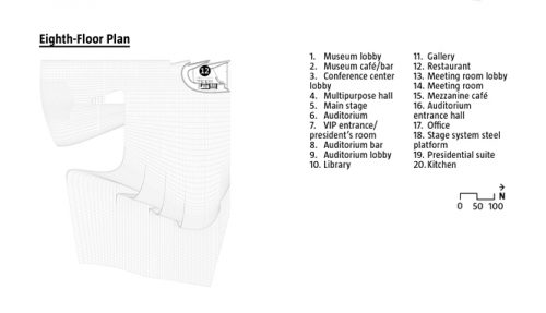 El proyecto, que está destinado a desempeñar un papel integral en la vida intelectual de la ciudad alberga un centro de conferencias con auditorio y salas, una biblioteca, un museo, restaurante y un aparcamiento.