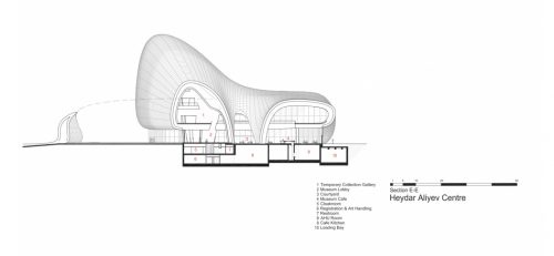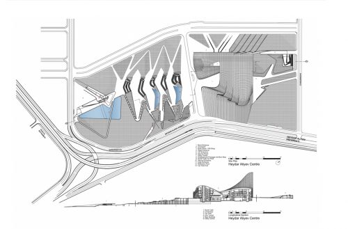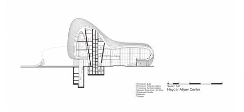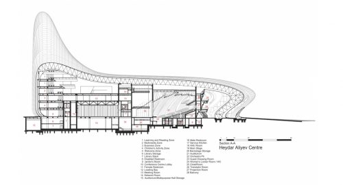 Según ha expresado Zaha Hadid en una conferencia, el complejo de Bakú en realidad consta de tres edificios, un centro de conferencias, un museo y una biblioteca, conectados a través de un espacio interior y por la curva y «fluida» piel exterior que serpentea a través de toda la estructura.