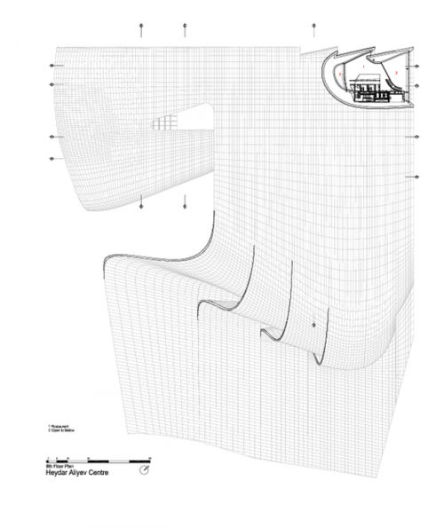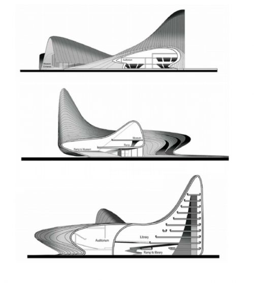 El Centro de Heydar Aliyev , representa una forma fluida que emerge por el plegamiento de la topografía natural del paisaje y por la envoltura de las funciones individuales de su interior. Todas las funciones, conjuntamente con las entradas, están representadas por pliegues en una sola superficie exterior continua. Esta forma fluida da la oportunidad de conectar los diversos espacios culturales y, al mismo tiempo, proporcionar a cada elemento del Centro su propia identidad y privacidad. Siguiendo los pliegues interiores, la piel se erosiona hasta convertirse en un elemento más del paisaje interior del Centro.