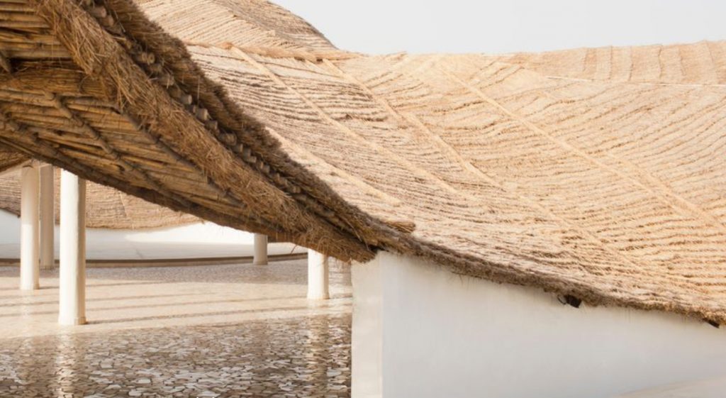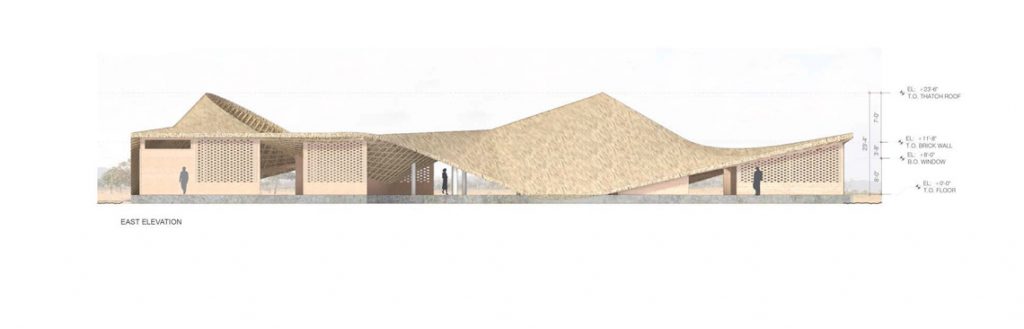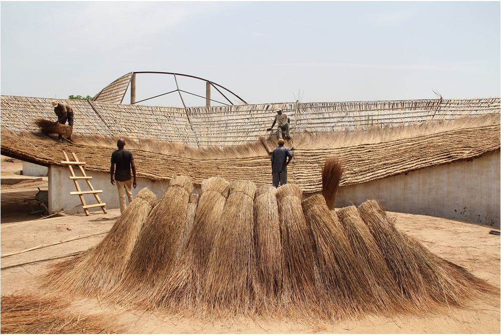 Otro de los logros más prometedores de esta colaboración es el techo. Es una costumbre local utilizar paja y pendientes muy inclinadas para permitir que el agua se escurra de los edificios. Aquí, esa misma tecnología se ha reorientado para que el despegue natural permita recoger y desviar el agua hacia las cuencas adyacentes. La cubierta de paja está apoyada sobre un marco que se apoya en numerosas columnas.