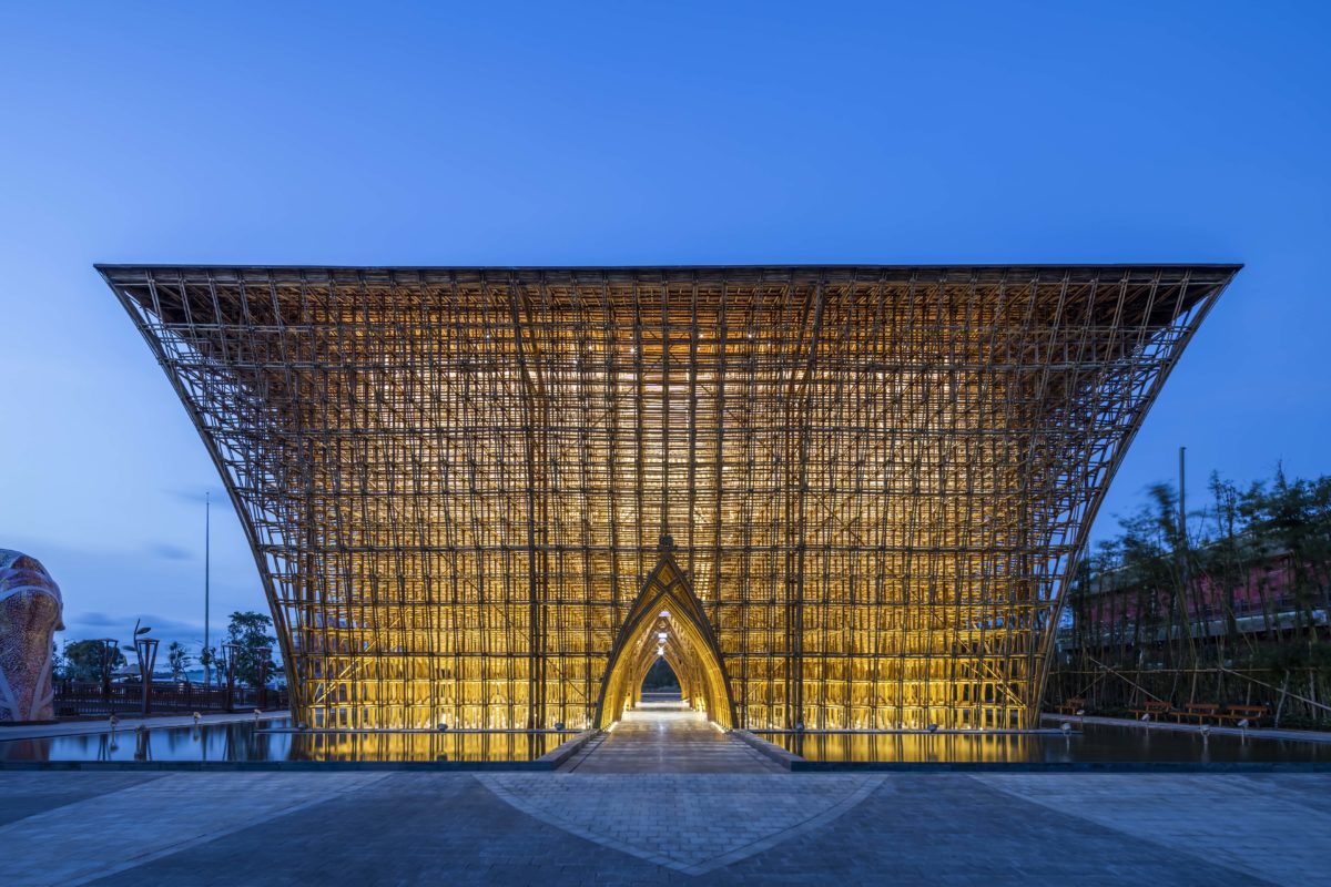 El edificio de bambú alcanza una altura total de 14,8 metros y consta de una base de hormigón y un techo de paja, con una claraboya instalada para maximizar la entrada de luz natural. La estructura principal está formada por muchas capas de secciones modulares de bambú, que se han unido cuidadosamente con cuerdas y pasadores también de bambú.