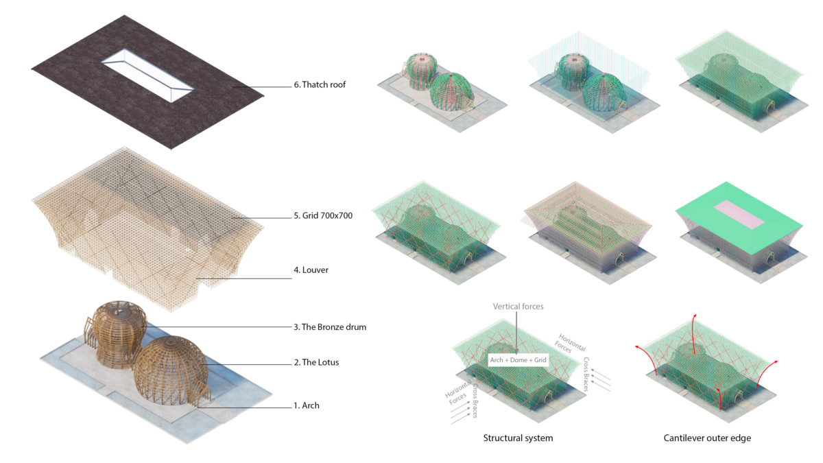 Los arquitectos respondieron creando una combinación de espacios duros y suaves dentro del espacio de las densas capas de rejilla de bambú, esculpidos en dos salas que toman la forma de loto y tambor de bronce, símbolos tradicionales en la cultura vietnamita, un espacio sistemático y preciso combinado con suaves arcos y cúpulas del mismo material.