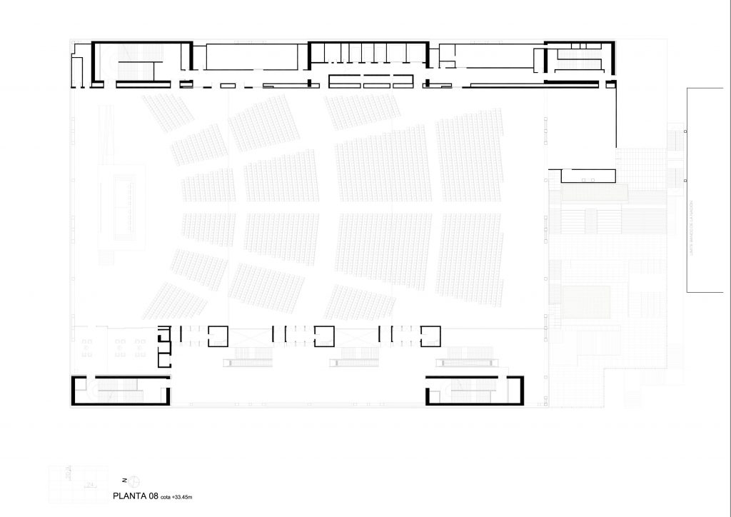 El presente, representado por el gran vacío inferior -Salas de la Nación- que acoge las dos salas transformables de alrededor de 1.800 m², una de las cuales se abre completamente al espacio urbano al recogerse los paneles acústicos que conforman su perímetro, generando una plaza urbana cubierta de más de 2.500 m².