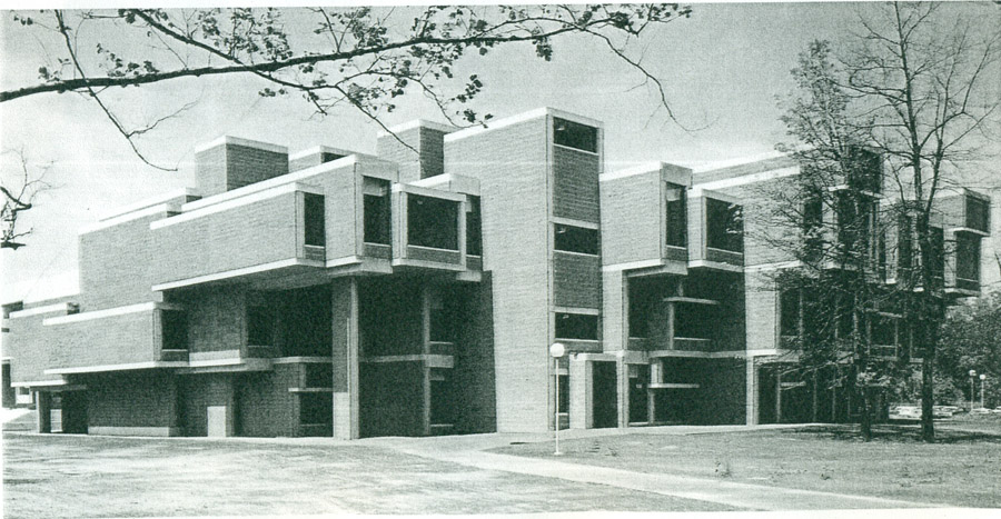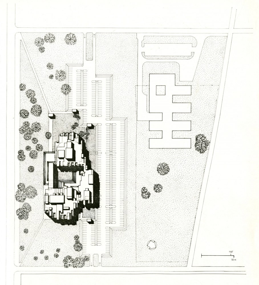El estilo claramente brutalista deriva del interés de Paul Rudolph en “trabajar” con el concepto de espacios entre líneas de Mies van der Rohe.
