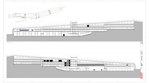 En sección, la obligada adaptación al terreno da pie a desfasar una planta entera de 3,2 metros de altura en cada salto, con la ventaja de la conexión al mismo nivel entre naves alternadas. Para limitar la excavación al máximo, a los efectos de sostenibilidad, hemos situado el aparcamiento en la cubierta del edificio, una cubierta de muy fácil acceso gracias a la topografía existente. El resultado es un largo «portaaviones» surcando el mar de pinos con una cubierta que es a la vez plataforma de acceso.