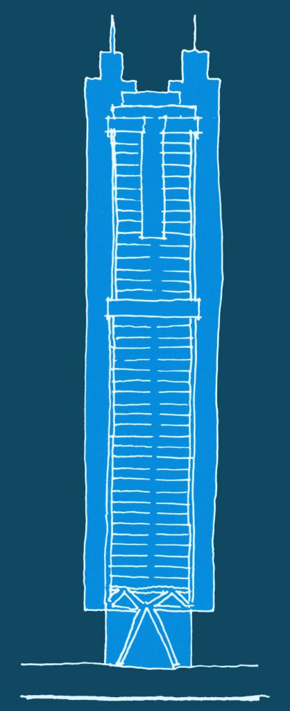 La concepción del arquitecto de utilizar el armazón estructural como muro pantalla que delimita el edificio es reforzada por las re-entradas formadas por detrás de los núcleos de columnas, espacios en los que se colocaron los ascensores de servicio. Los extremos romos de la torre y del edificio menor se elevan hasta la cúspide y desestructuran los laterales mediante una franja ininterrumpida de ventanas que envuelven las esquinas. Las torretas gemelas, que evitan concentrar la energía negativa tradicionalmente relacionada con un único remate, forman un espacio combinado para torres de refrigeración y un pórtico para asentar las grúas.