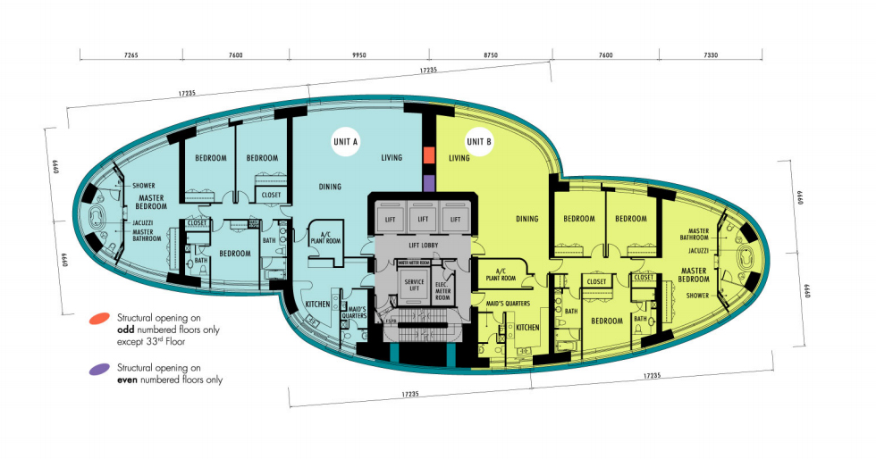 El plano del edificio está formado por dos elipses cruzadas que se desarrollan individualmente en torno a un núcleo central común, destinado a ruta de circulación en la parte inferior y a unidades individuales de grandes dimensiones en la superior. Pese a la forma oval de la estructura exterior, interiormente los planos de las viviendas se distribuyen de forma ortogonal.