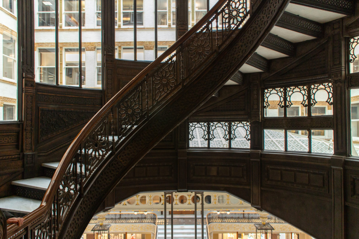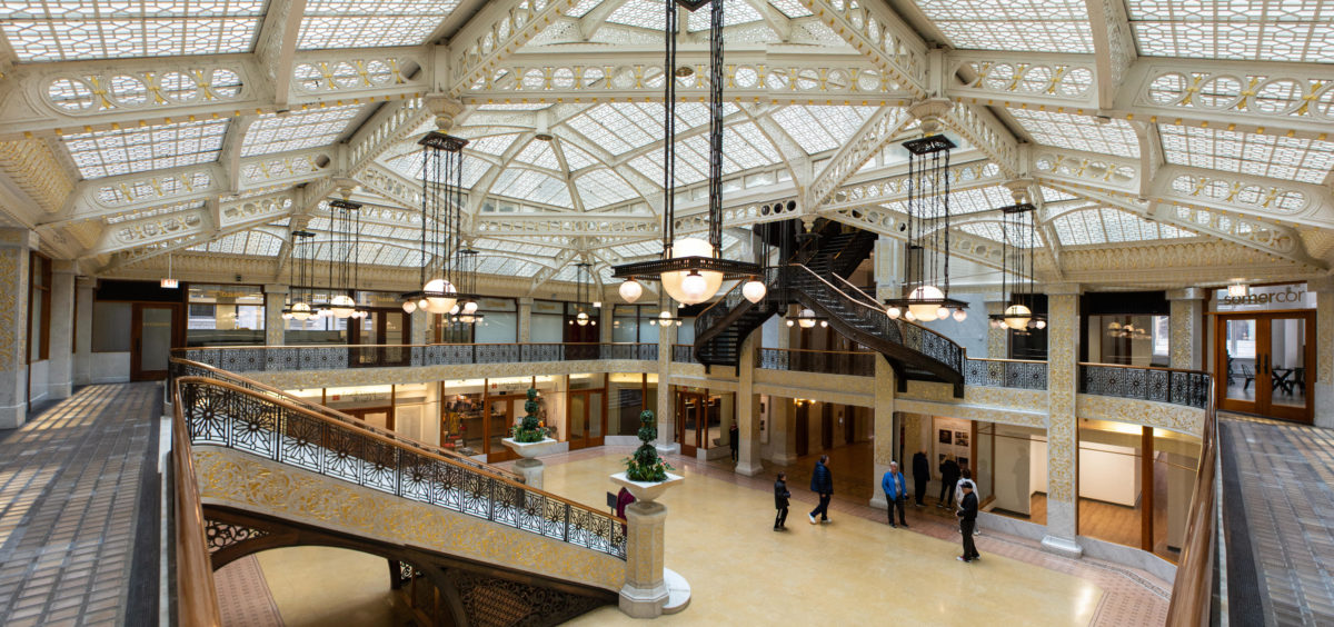 Protegido por un techo de cristal, el espacio público del vestíbulo de dos pisos sigue llamando la atención de quienes lo visitan. Los pilares rodean el espacio con molduras revestidas de mármol blanco con motivos geométricos dorados.