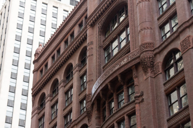 La fachada de mármol rojo, granito, terracota y ladrillos marrones del edificio es una combinación de los estilos del Renacimiento Romano, el veneciano, morisco y medieval-europeo. Originalmente elaborados mosaicos colocados a mano cubrían el piso del vestíbulo.