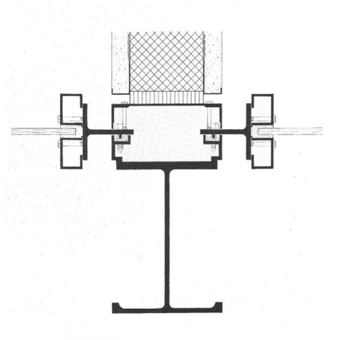 Los perfiles de acero vistos, en sus edificios americanos, raramente son idénticos a las estructuras constructivas, porque la legislación policíaca de prevención contra incendios prescribe el revestimiento de acero. Por lo tanto la “estructura” visible simboliza la realidad oculta, como en el Renacimiento el pilar habia simbolizado la columnas. Pero las relaciones de las pseudoconstrucciones de Mies con las reales convencen más. Con el alfabeto estandarizado de la producción siderúrgica, los perfiles en I, H y L, Mies forma por soldadura perfiles que constituyen el equivalente de los perfiles cincelados del pasado. La cuidadosa proporción del esqueleto, la graduación de los distintos componentes de pesado a ligero, la elegancia segura de sus perfiles y las sutiles transiciones en las esquinas o en los puntos donde coinciden varios materiales. Este máximo de reflexión y comprensión artística no ha sido nunca alcanzado por sus seguidores.