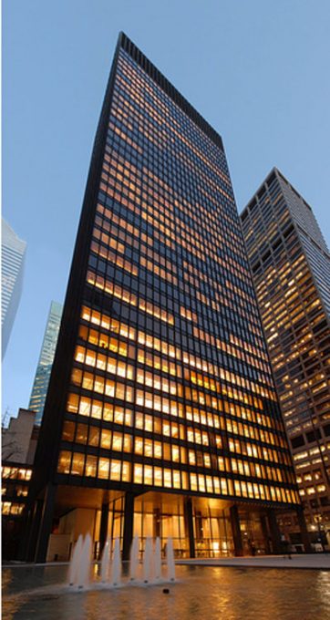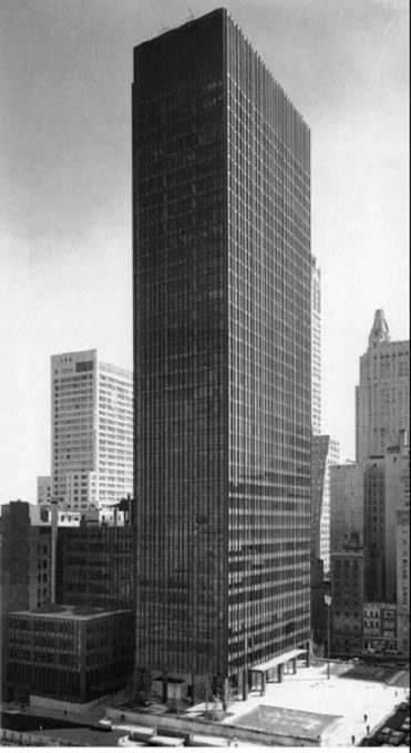 Este rascacielos de oficinas edificado en Nueva York en 1958 constituye en muchos aspectos la culminación del proceso de depuración expresiva, sin ninguna concesión a lo ornamental, para edificios en altura que Mies van der Rohe había iniciado a comienzos de la década con los Apartamentos Lake Shore Drive 860- 880 y había continuado con otros ejemplos en Chicago como los departamentos del Paseo del Commonwealth y los Esplanade. Es un muestra de su mentalidad racionalista, un ejercicio de elegancia arquitectónica en el que el uso mesurado de pocos elementos da como resultado una de las más bellas joyas de la arquitectura del siglo XX.