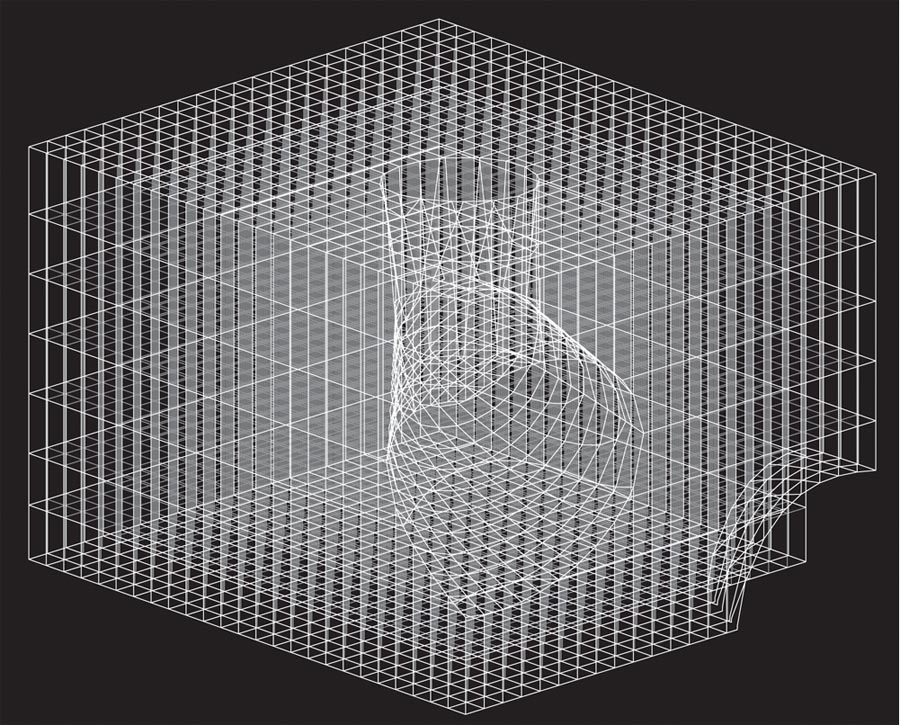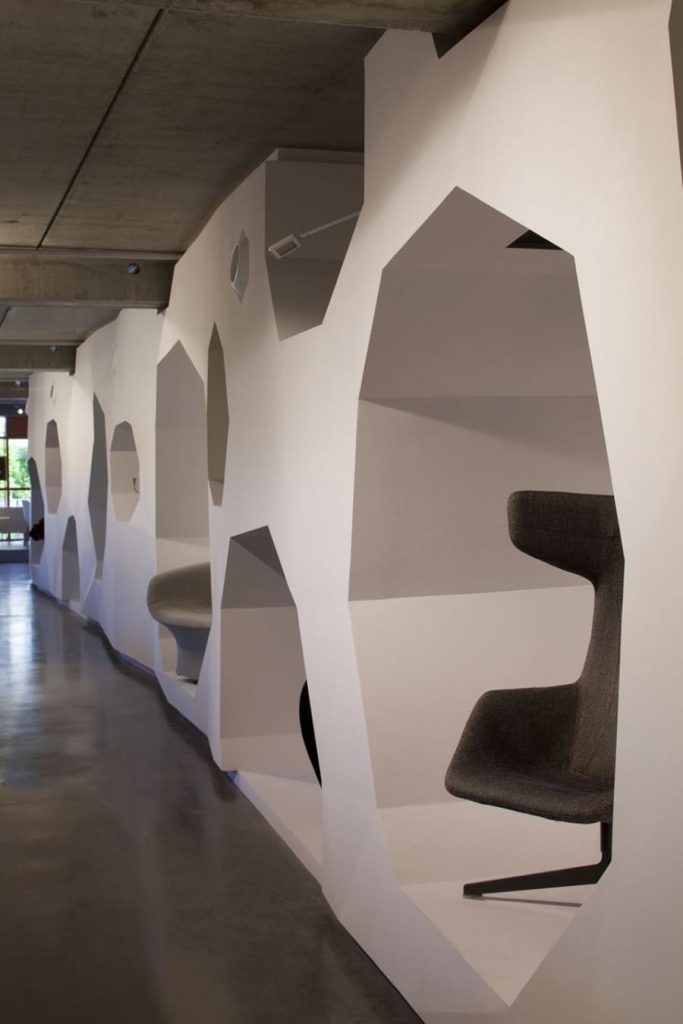 Con el fin de crear el vacío, los arquitectos trabajaron con una serie de perturbaciones volumétricas, vinculadas a la sustracción de tres volúmenes cónicos dispuestos en tres niveles: el ángulo de la fachada, el techo y el nivel de la entrada. Estas perturbaciones generan espacios y relaciones entre el edificio, los usuarios, el lugar y la fuente de luz, todos ellos dentro de un programa común de oficinas.