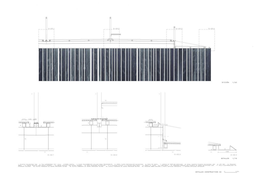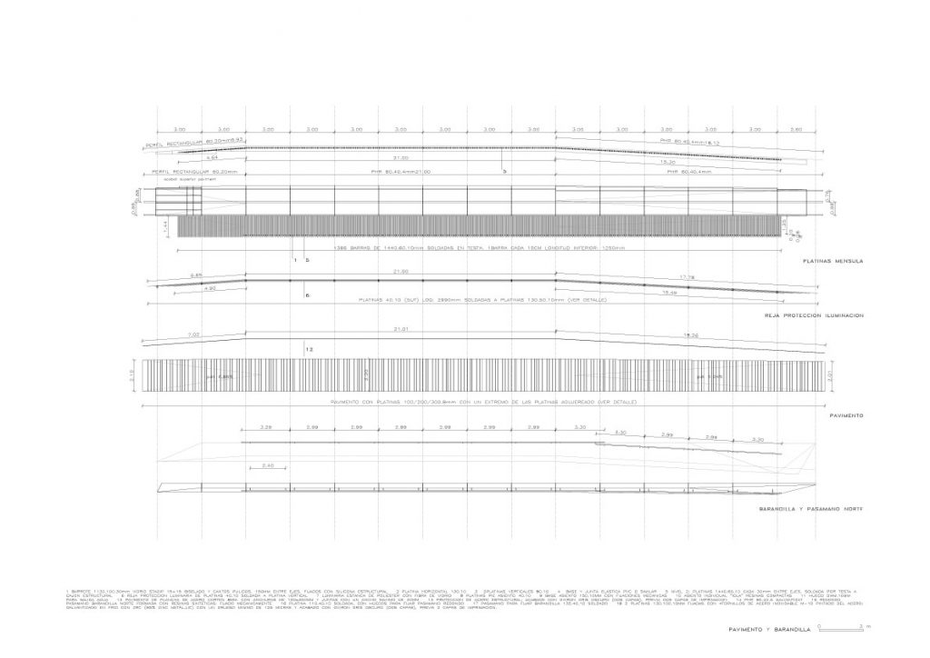 El proyecto mantiene la condición de vacío pasante, de intersticio a gran escala, pero quien discurre por su plataforma se verá atrapado por el ritmo discontinuo que marcan los planos laterales y el techo, formados por bandas metálicas de anchos variables, que tamizan la luz, permitiendo que crezca vegetación y que se cuele el sol.