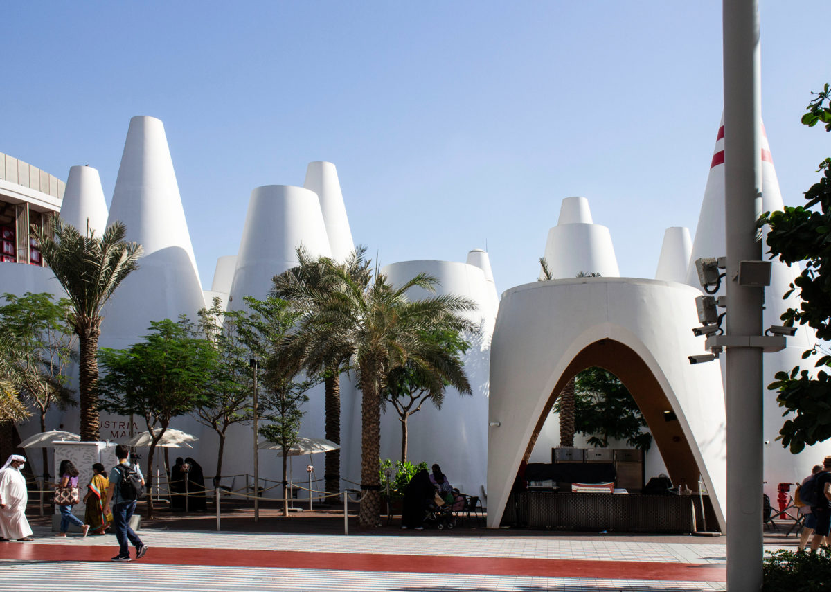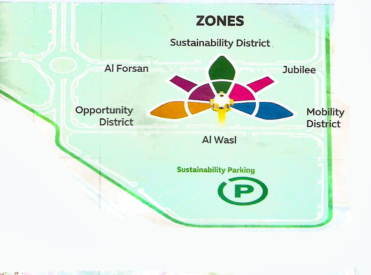 El equipo planeó el sitio para que sirviera como punto de referencia sostenible para eventos en el Medio Oriente. Una estructura de tela fotovoltaica cubre los pasillos principales, actuando como un parasol alimentado por energía solar que combinándose con paneles fotovoltaicos en las fachadas de los edificios capturan suficiente luz solar para generan al menos la mitad de los requisitos de energía de la Expo. Otras estrategias sostenibles incluyen el reciclaje de aguas residuales, la reutilización de materiales y el seguimiento de la huella de carbono de la Expo.
