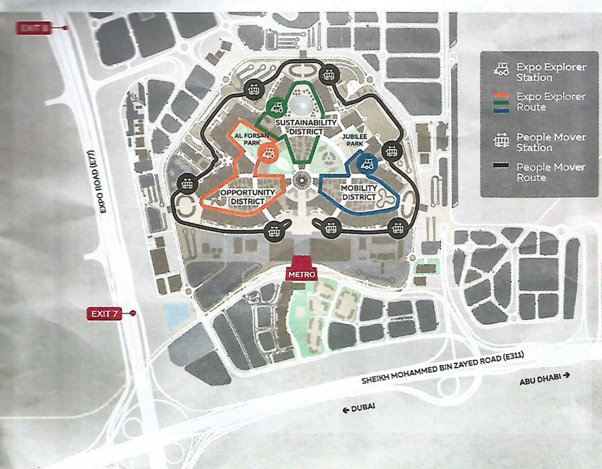 El diseño cuenta con tres pabellones que simbolizan la Oportunidad, la Sostenibilidad y la Movilidad. Estas tres zonas emanan de una plaza central llamada Al Wasl, el nombre árabe histórico de Dubái que significa “la conexión”. Inspirado en el diseño de un «zoco» o mercado árabe tradicional, el diseño coloca pabellones más grandes en el perímetro mientras que los espacios de exhibición más pequeños se agrupan hacia el centro para ayudar al flujo de peatones y la interacción.