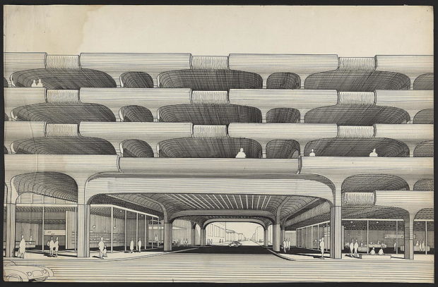 El arquitecto sostuvo que en un principio había considerado hacer un garaje-puente con 518m de largo que uniría las partes de la ciudad que las nuevas carreteras habían separado y a la vez oficiara de monumental entrada a la ciudad. Aunque éste no se llegó a realizar, el proyecto construido es una inmensa estructura con media manzana de ancho y dos de largo, con 6 niveles para estacionamiento, 2 de ellos subterráneos. Los niveles de aparcamiento, alternados a niveles con altura de medio piso, salen a las rampas que se ubican en el eje del edificio.