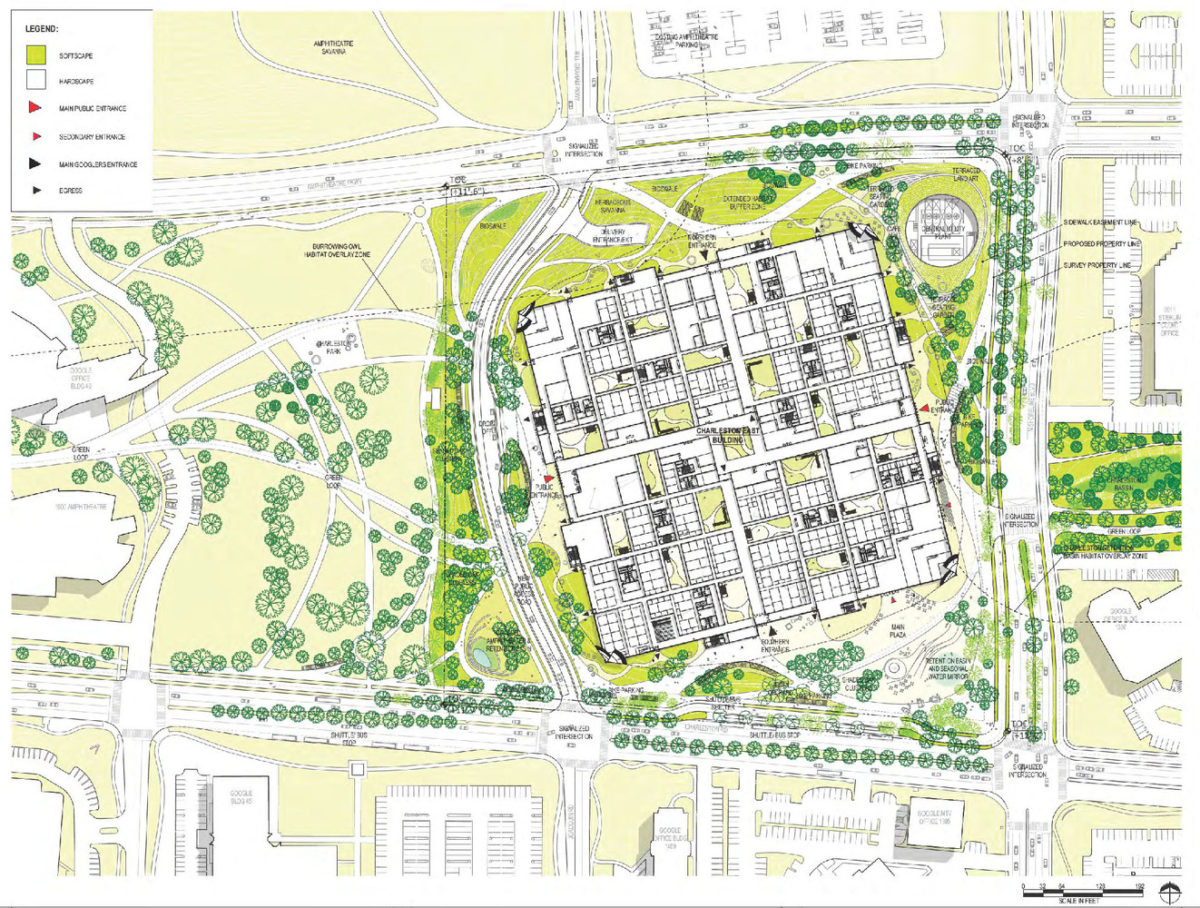 Como atajo, el interior del campus tiene un callejón central público, proporcionando a los peatones una conexión directa desde Charleston Park hasta el circuito verde de North Shoreline Boulevard.