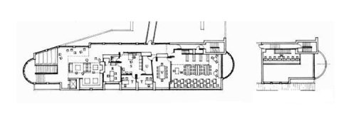 En el vestíbulo de entrada, sobre la izquierda, una escalera conduce a través de un gran ventanal, hacia un salón de descanso, a las oficinas administrativas y a la biblioteca en el piso superior. El salón y la biblioteca incluyen cada uno grandes ventanales, ampliando visualmente sus espacios relativamente pequeños.