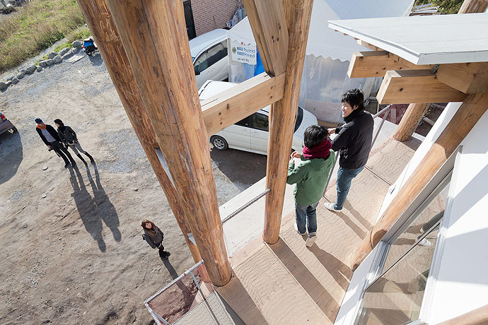 La estructura vertical fue construida con 19 troncos de cedro despojados de su corteza. Estos fueron seleccionados de árboles arrancados por el tsunami en una reserva natural cercana, el bosque Takata- Matsubara. La construcción tipo alcanza una altura de 9.75m y ofrece una superficie de 29,96 m², distribuida en varios niveles rodeados con balcones de madera.