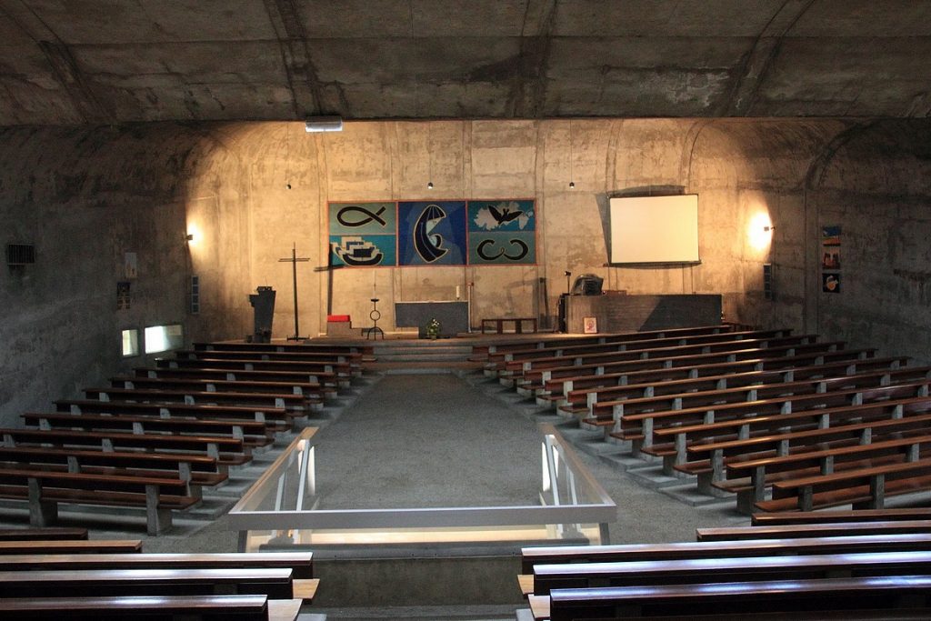 El gran vestíbulo está delimitado por láminas de hormigón continuo. La capilla, a la izquierda de la entrada, es de tamaño pequeño y está separada del vestíbulo por una doble pared de hormigón. Por último, el baptisterio, a la derecha, se abre hacia el vestíbulo, refugiándose en una de sus cavidades.