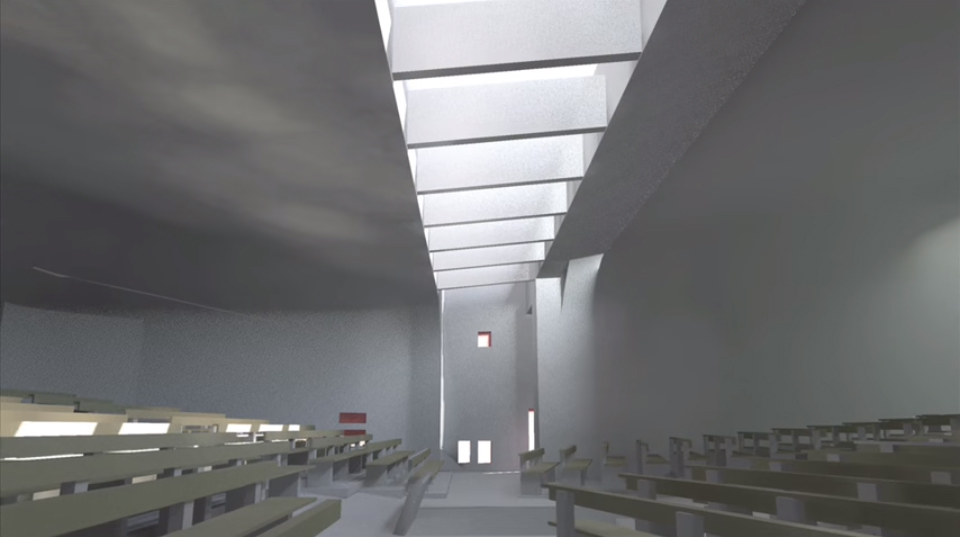 La sala de catecismo está iluminada por una pared de cristal grande, sostenida por montantes de aluminio