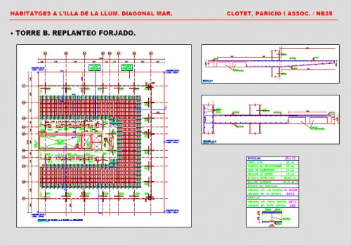 El grosor del forjado en el tramo del voladizo va disminuyendo según nos acercamos a la fachada para reducir su peso propio y soportar mejor las cargas sin deformarse. Los momentos negativos generados por este voladizo ayudan a trabajar al forjado reticular situado entre pilares con 9 metros de luz haciendo que las tensiones que se genera en este sean equivalentes a las de luces de 6 metros. Se trata de un forjado reticular de casetones no recuperables.