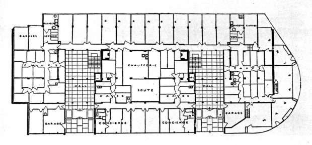 En base a las ideas propuestas por el industrial Le Corbusier va desarrollando los planos del futuro edificio: dos núcleos de escaleras, renuncia al corredor central y a la disposición de los primeros apartamentos proyectados. Sobre la cara norte del edificio y sobre una gran base de hormigón y acero con una planta de altura se ubican las dos entradas, las salas de servicio (lavanderías, depósitos, bodegas), alojamientos para porteros (uno en cada volumen). En los bajos de la cara sur se colocaron varios garajes. De este modo Le Corbusier aplica el modelo del “immeuble villa” al utilizar la planta baja como un gran taller para trabajos domésticos.