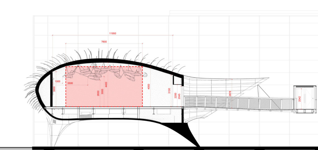 El acceso se realiza a través de un puente recubierto de cristal que conduce al “hocico” de la estructura y que la une al edificio principal. Su interior es un espacio tipo cueva, con techo curvo y paredes pintadas con salpicaduras de color naranja (bacterias), mientas que los grumos de espuma acústica en forma de nube, cubiertos con una malla de aluminio arrugada, se ciernen sobre la cabeza del visitante. Complementada con iluminación programable de colores, crea un espacio divertido para espectáculos de ciencias en vivo, talleres prácticos, experimentos, debates, películas y exposiciones.