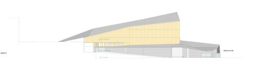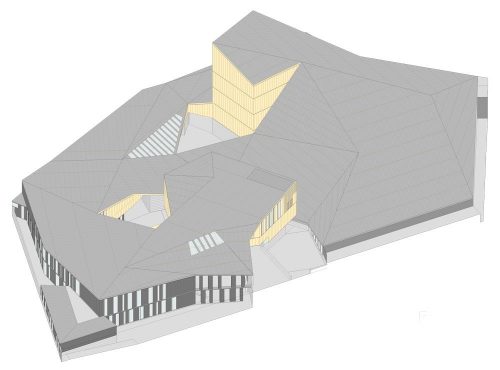 Este gesto se ha aprovechado para dotar al edificio de un pasaje público interior que conecta el río con la ciudad a través del mismo, vertebrando todo el programa y dándole sentido urbano, conectando diversos patios abiertos entre pliegue y pliegue de la cubierta en un recorrido semiexterior.