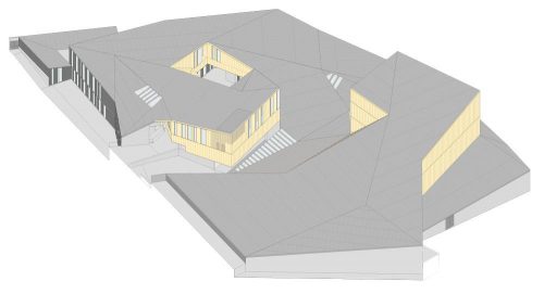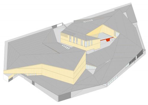 - Utilizar el acceso de “Can Serratosa” que llega al espacio libre, como eje vertebrador que sitúa y da acceso a todas las partes del complejo. También la utilización de la cubierta inclinada, la cota más alta de la caja escénica que desciende y se despliega hasta cubrir porches y aulas.