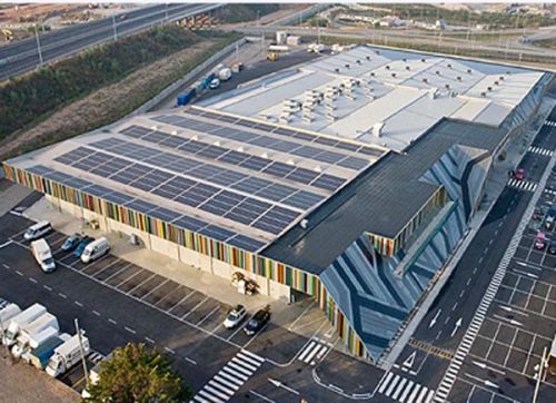 En la cubierta del mercado se ha instalado una alfombra de placas fotovoltaicas de 3.000 m2 que ocupa un 30% del total de dicha cubierta y produce energía.