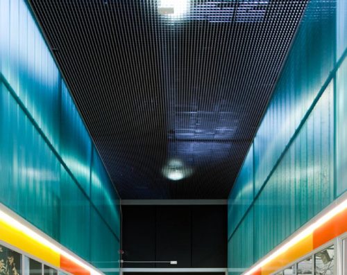 La cubierta está realizada con placas de zinc brillante en diferentes tonos y decorada con paneles perimetrales rayados de colores. La estructura es de acero.