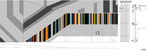 La cubierta que es el elemento integrador de este mercado, está remarcada con una gran cenefa de multitud de colores que sube y baja para organizar entradas en diferentes espacios del edificio, un toque de movilidad y de imagen gráfica acorde con este Mercado de la Flor.