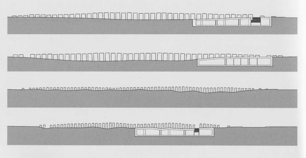 El laberíntico patio está formado por 2.711 bloques paralelepípedos de alturas variables, desde 20 centímetros hasta 4.70 metros. Los bloques alineados están dispuestos en un gran perímetro de forma ortogonal, sobre una base de terreno ondulado y a una distancia de 95 centímetros entre sí, de modo que solo deje pasar a una persona a la vez. Cada bloque tiene un tamaño de 2.38 x 0.95 metros.