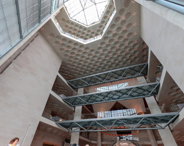 Los volúmenes angulares del edificio principal retroceden a medida que se elevan alrededor de un atrio abovedado de 50m de altura, diseñado por Pei y oculto desde el exterior por las paredes de una torre central. Un óvulo, en la parte superior del atrio, captura y refleja un patrón de luz moldeada desde dentro de una cúpula facetada, permitiendo que los rayos de luz se muevan por su superficie, dando vida y movimiento al espacio de abajo. Sobre el comienzo de la escalera, debajo de la cúpula, cuelga una espectacular y tubular araña circular de luces con un diámetro de 12m,