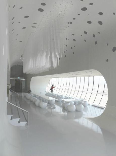 Buscando armonizar con el paisaje se proyectó un edificio con formas suaves, redondeadas, biológicas, casi animales. Su piel exterior de acero inoxidable sigue un patrón microperforado, crea una superficie moderna inspirada en pieles de serpientes y dragones coreanos. Por la noche estas perforaciones se encienden, cobran vida, su luz se mueve a lo largo de la superficie.