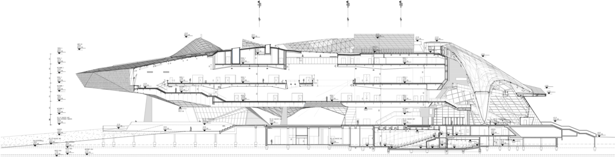 Para construir el edificio se tuvo que desarrollar una forma nueva y compleja que sería la icónica puerta de entrada a la ciudad. Un edificio que realmente destaque solo puede nacer a través de las formas resultantes de nuevas geometrías. Era importante para el concepto que el flujo de visitantes que llegaran a la ciudad, al Pointe du Confluent, no se viera obstaculizado por un edificio. Por lo tanto, la idea era desarrollar una construcción abierta y transitable, que flotara sobre soportes y creara debajo un espacio público.